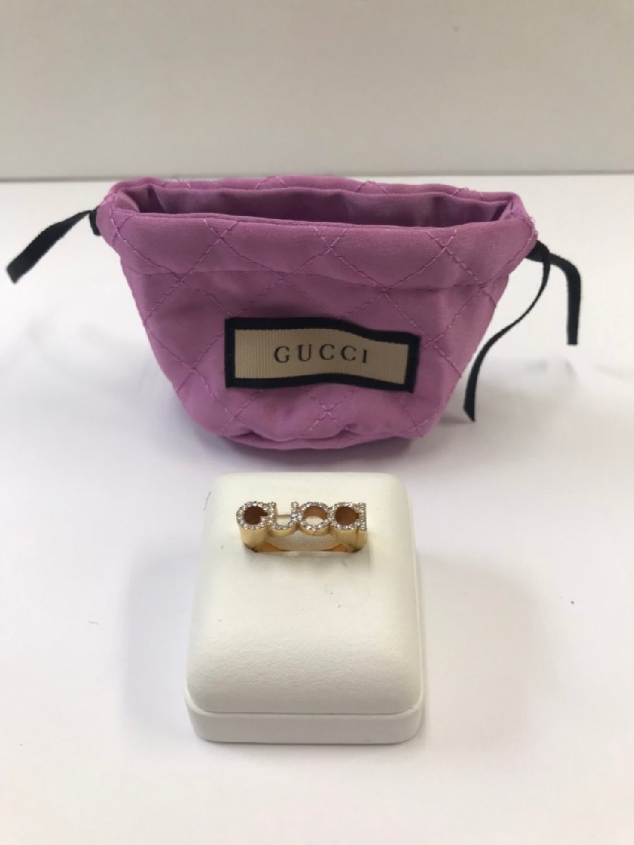 - 【GUCCI】スクリプト イエローゴールメッキ ラインストーン リング Sサイズ 約13号 保存袋付き