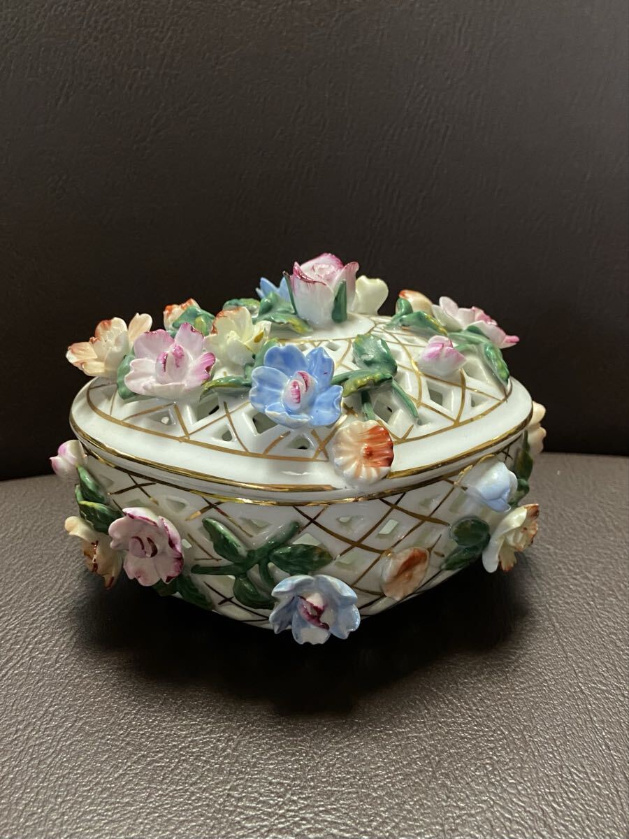 > ファインポーセリン キャンディボックス 陶器 陶花 FINE porcelain 花柄 レトロ アンティーク 小物入れ 目抜き メッシュ 白磁 金彩
