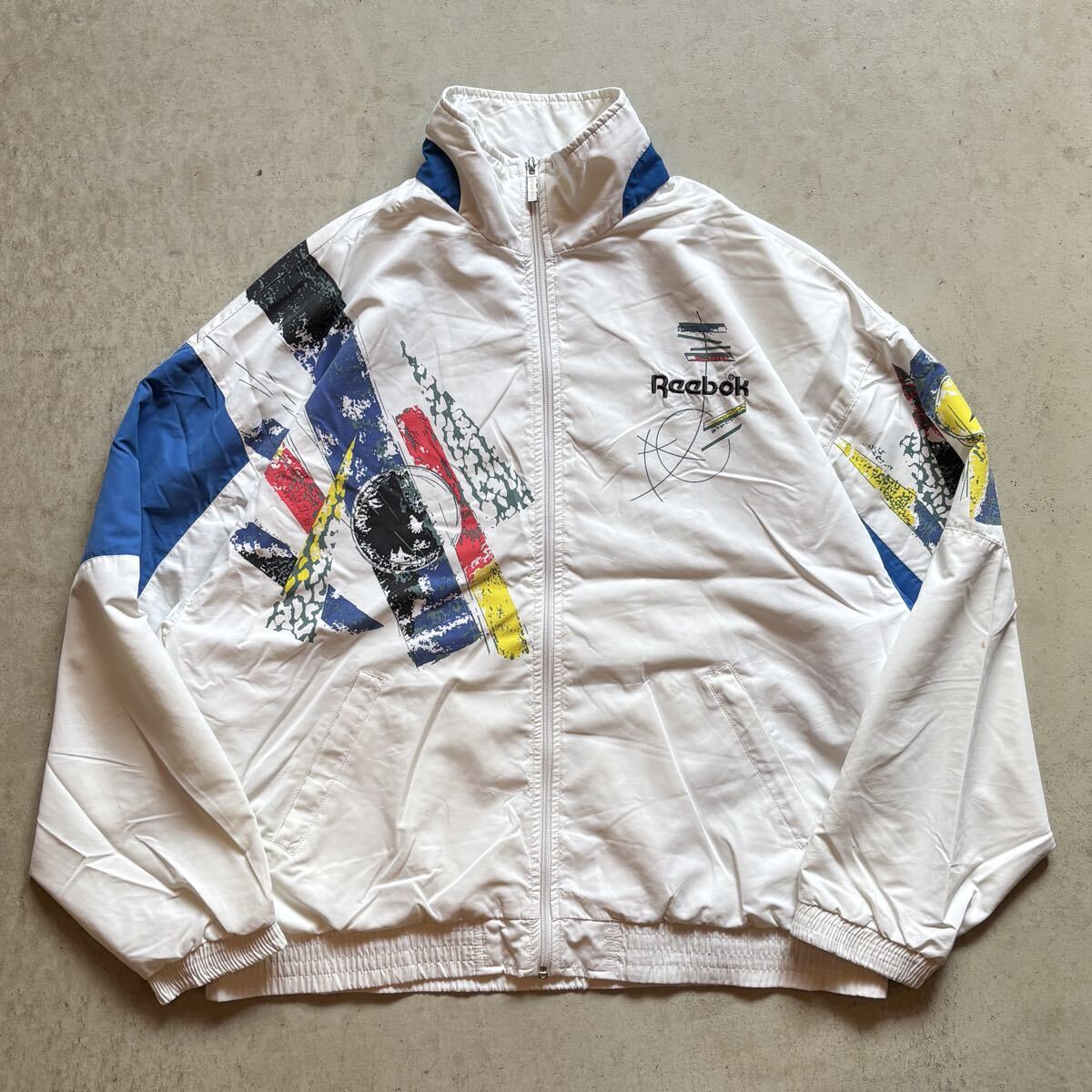 > 【90s】Reebok リーボック ジャケット ブルゾン ウインドブレーカー メンズ M 白/WHITE ロゴ 刺繍 総柄 プリント スポーツ VINTAGE 正規