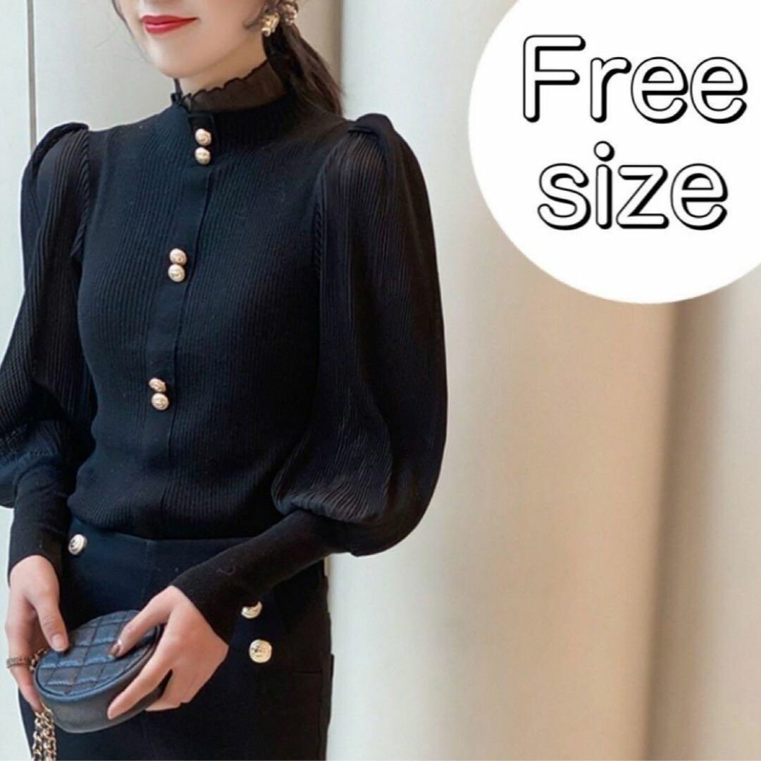 - 大人フェミニン シフォン袖 ニットトップス クラシカル 上品 ブラック