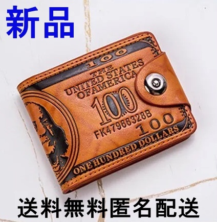 > 新品未使用 100usドル柄財布 ブラウン レザー財布フォトカードホルダー 二つ折り財布 メンズPUレザーウォレット 送料無料