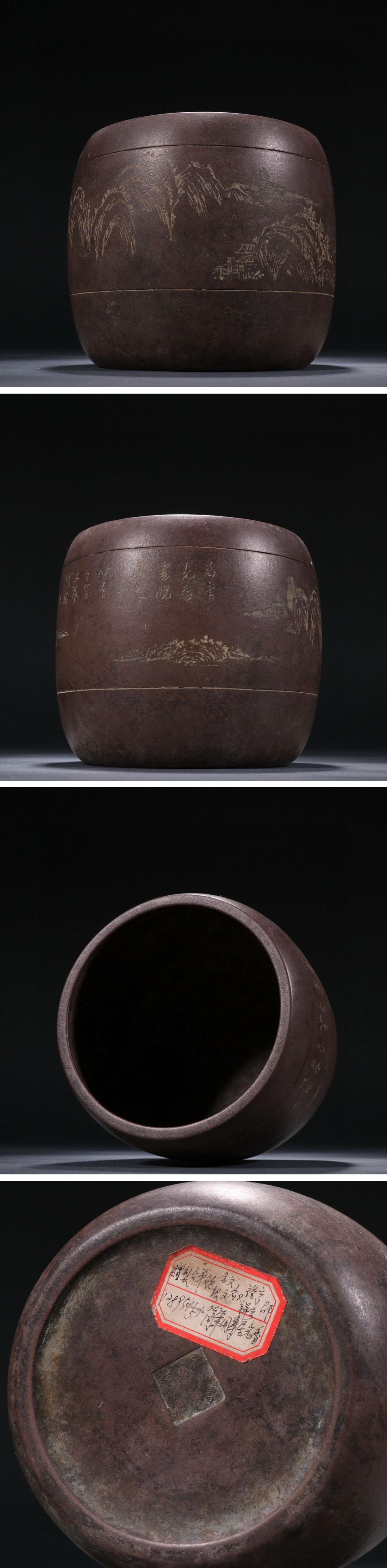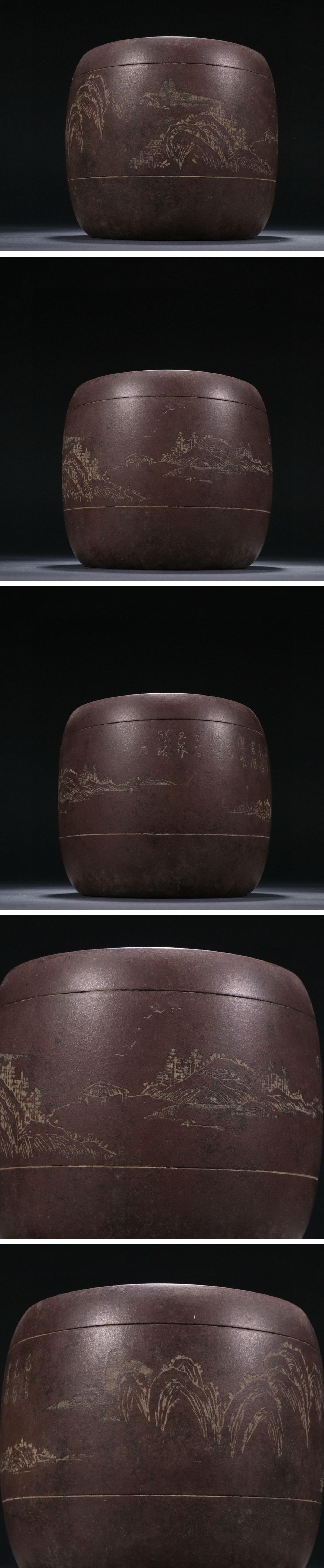 > 【清】某有名オークション購入 清時代 紫砂 朱泥 山水楼閣図建水 茶煎道具 古置物 古擺件 古美術 時代コレクション7L9-US5