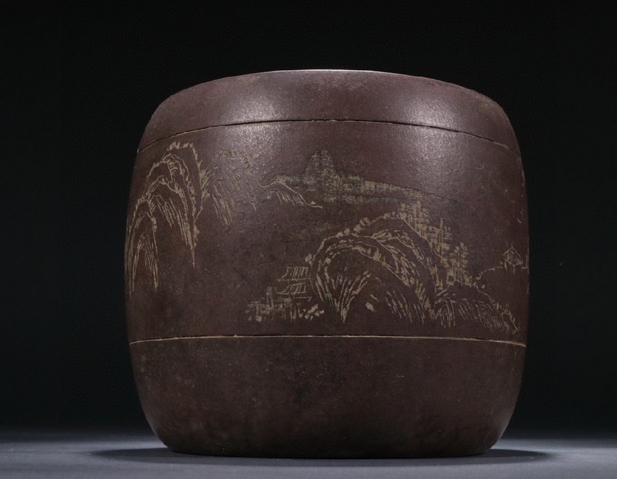 - 【清】某有名オークション購入 清時代 紫砂 朱泥 山水楼閣図建水 茶煎道具 古置物 古擺件 古美術 時代コレクション7L9-US5