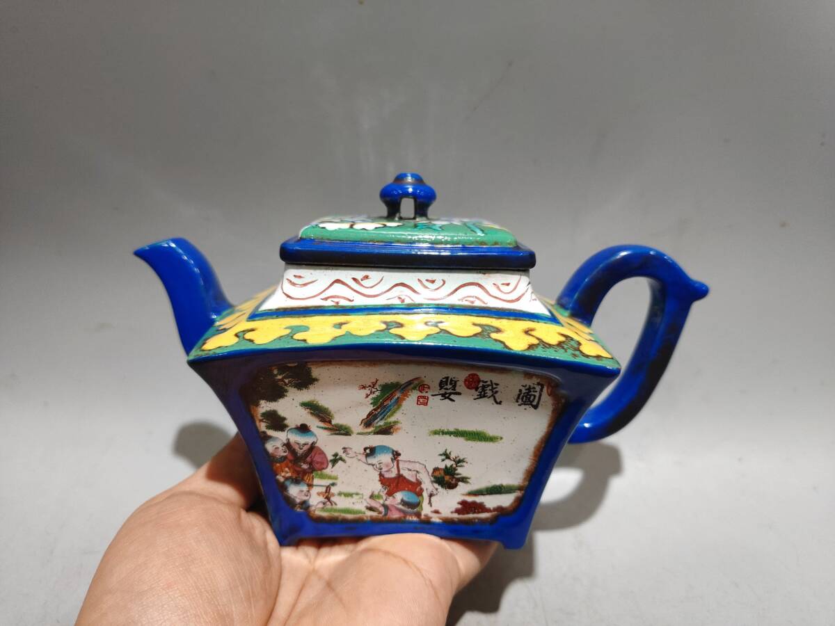 > 蔵友旧蔵出 紫砂壺 點彩扇形嬰戲図壺 呉雲根款 原礦紅泥 箱付 茶道品 煎茶道具 文房賞物 希少珍品 中国古玩 中国古美術品