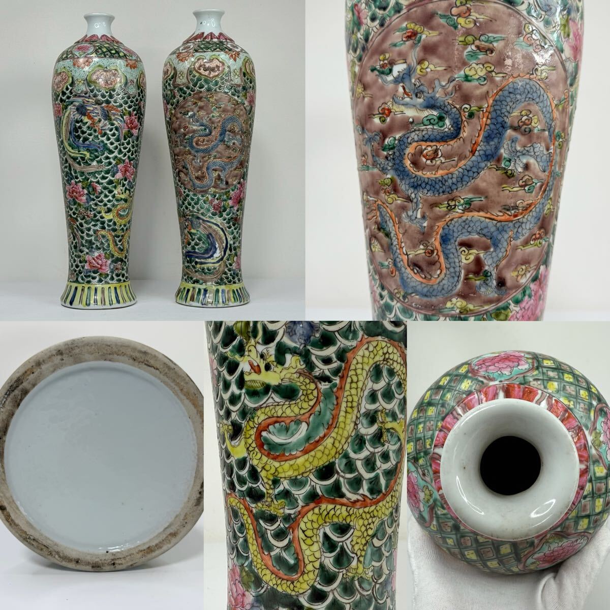 > F4-中国古美術 時代物 花入 花器 花瓶 ペア 色絵 粉彩 龍図 大梅瓶 唐物 陶磁器 中国古玩 骨董品