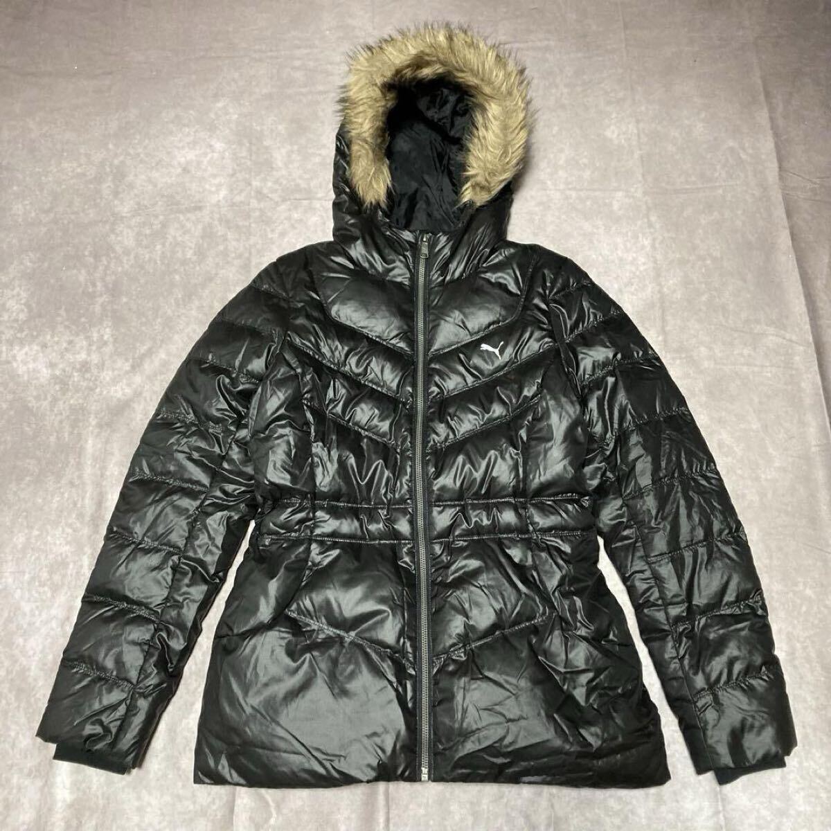 - 美品 プーマ PUMA (US S) アウター ダウンジャケット フーデットコート フード 内ポケットあり ウエスト絞りあり フードファー 黒 ブラック
