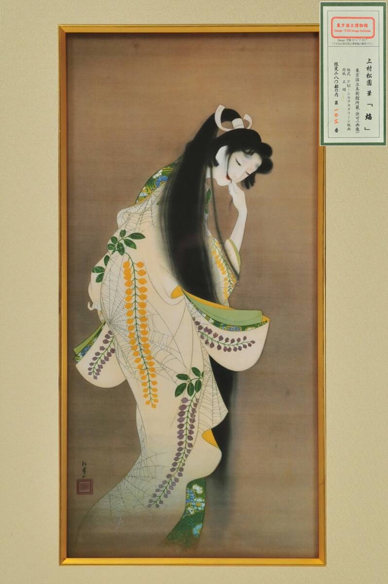 - 【真作】 上村松園 シルクスクリーン 『焔』 103/280 額装:約74×44 黄袋 差し箱 絹本 美人画 03408005-1
