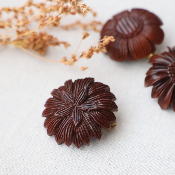 - 新作 手彫り ウッド ブローチ ウッドカービング 天然木 花 モチーフ ダークブラウン Q14A