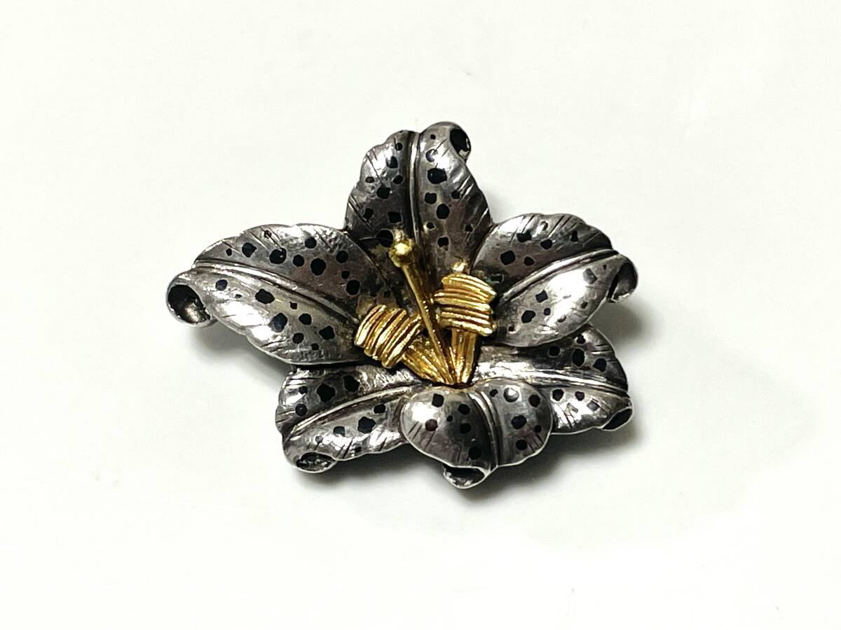 - 金工 帯留 百合 純銀 象嵌 11,4g 在銘 春利 名工中村春利 桂光春門人 特製桐箱入り(彫金、明治金工、前金具、帯留め)