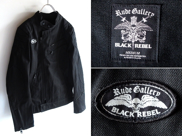 > 美品 良好 RUDE GALLERY BLACK REBEL ルードギャラリー CASCADE型 スカルロゴワッペン ブラックデニム ダブルライダースジャケット M 黒