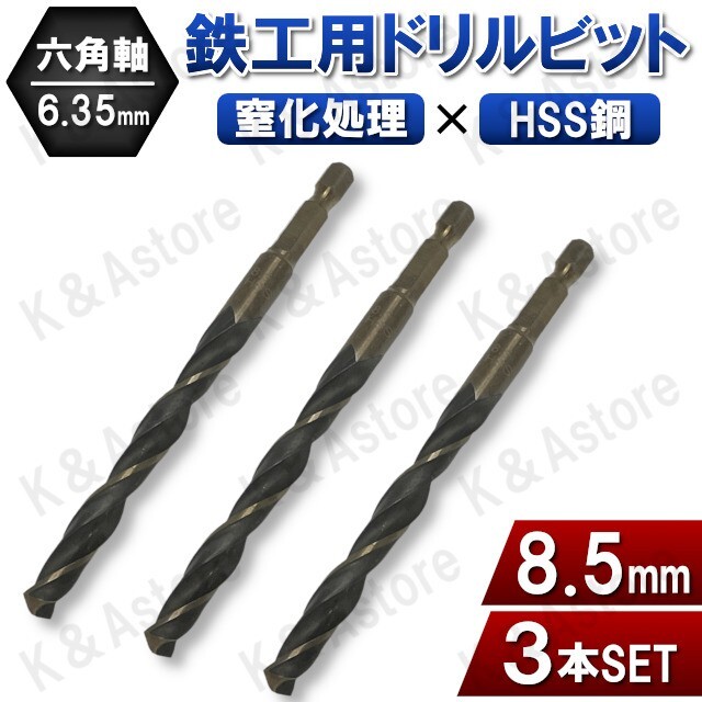 - 六角軸ドリル ビット セット 鉄工用 8.5mm 3本 ドリル刃 穴あけ 穴開け インパクトドライバー 電動ドリル 金属 木材 工具 DIY ハイス鋼 HSS