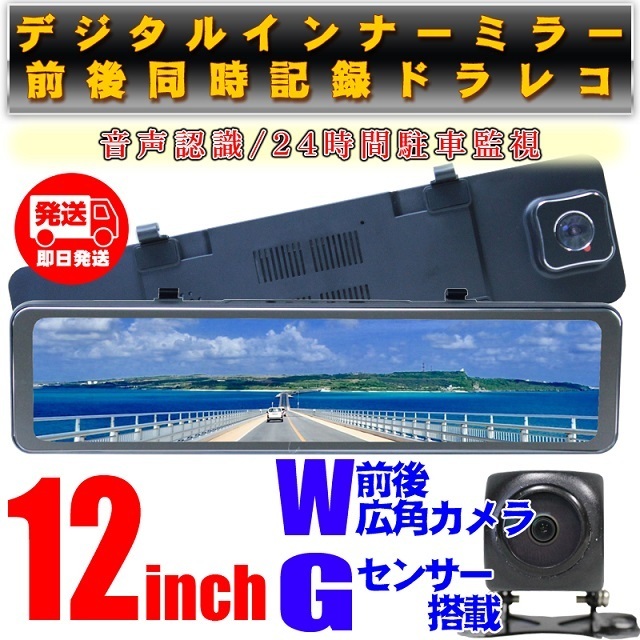 - 最新型 前後広角カメラ搭載12インチ デジタルインナーミラー 前後同時記録ドライブレコーダー バックモニター 音声認識 車線逸脱防止