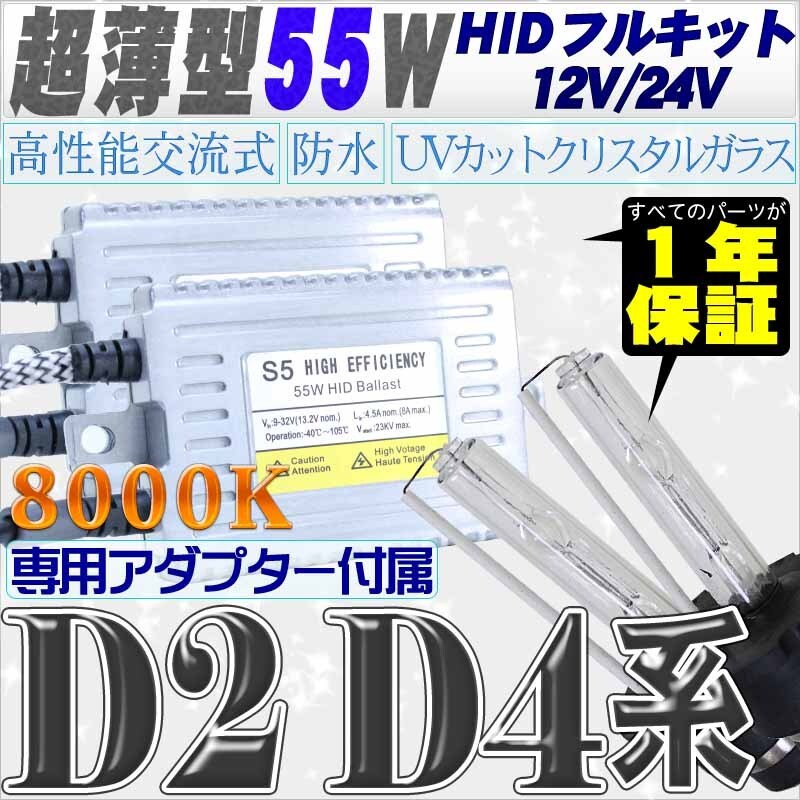 - 高性能 薄型HIDキット 55W【D2C/R/S】【D4C/R/S】 リレー付 8000K 12V/24V 【交流式バラスト&クリスタルガラスバーナー】