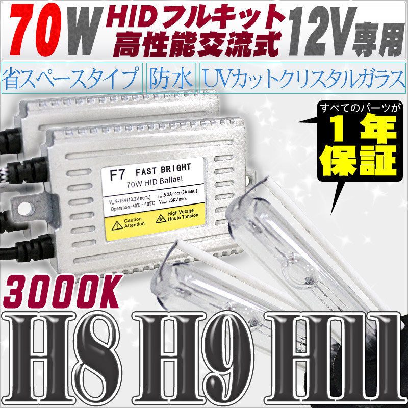 - 高性能 HIDキット 70W H11/H8 3000K 【交流式バラスト&クリスタルガラスバーナー】 12V用
