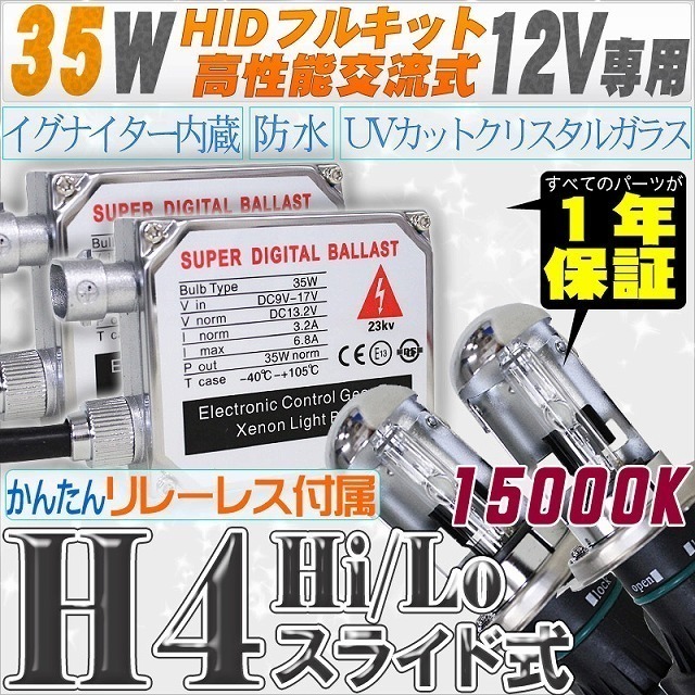 > 高性能 HIDキット 35W H4 Hi/Loスライド式 リレーレス、キャンセラー付 15000K 【交流式バラスト&クリスタルガラスバーナー】