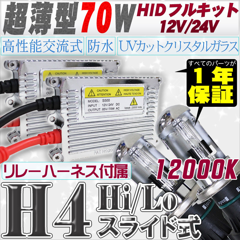 - 高性能 薄型HIDキット 70W H4 Hi/Lo スライド式 リレー、キャンセラー付 12000K 12V/24V 【交流式バラスト&クリスタルガラスバーナー】