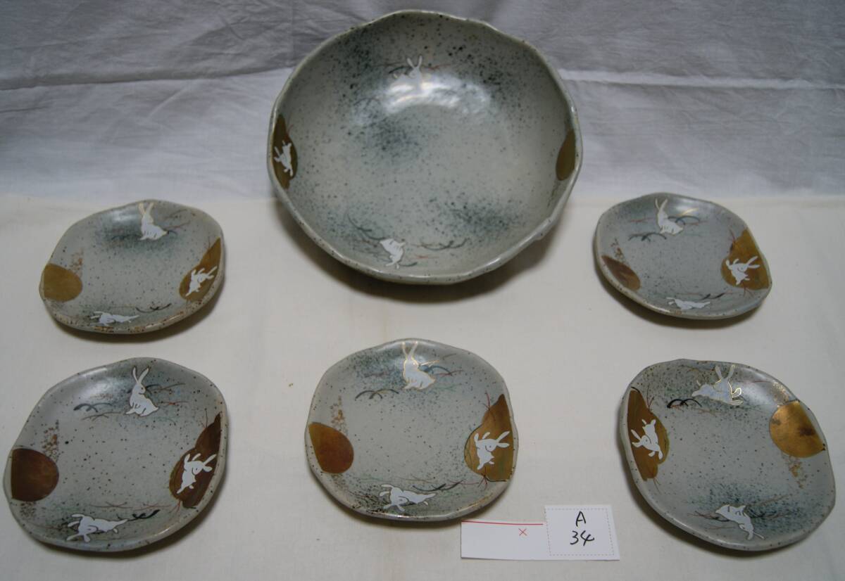 - 本物保証 魯山人 兎の図柄 染付金彩 大皿1枚 小皿5枚 昭和30年頃の皿 魯印有り 返品 OK 241122−1