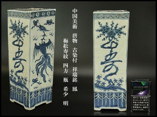 - 【銀閣】中国美術 唐物 古染付 祥瑞銘 鳳 梅松寿紋 四方 瓶 高28cm 希少 明 旧家蔵出 送料無料(MG781)