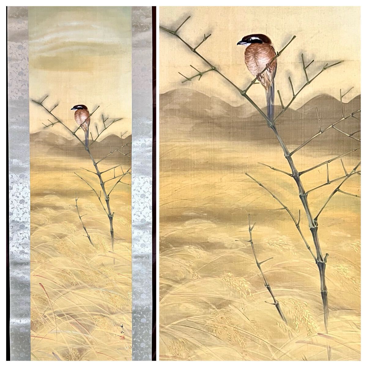 【真作】【S8】吉川秀山「稲穂百舌之図」絹本 肉筆 合箱 秋景 花鳥図 鳥獣 もず 絵画 掛軸 明治-昭和時代の日本画家 長野 諏訪の人