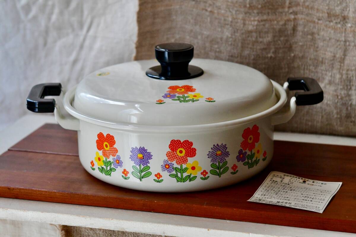 - 白地にオレンジのフラワー◎卓上鍋物に◎レトロ可愛い花柄◎ポップなホーロー両手浅鍋 琺瑯鍋 ご馳走鍋物うどんすきに◎昭和当時物