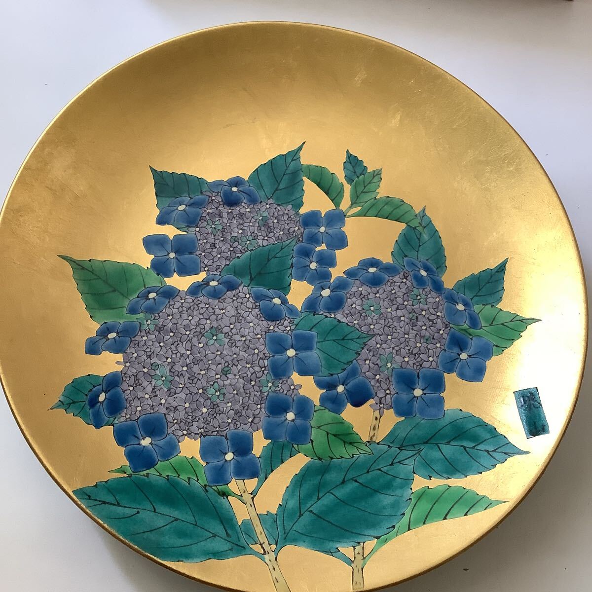 - 琥山窯 染錦紫陽花文金箔押 飾皿 九谷焼 色絵 飾り皿