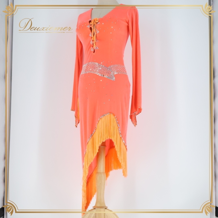 - 社交ダンス 衣装 ラテン ドレス ワンピース サーモンピンク デモ 競技 ダンス パーティ 舞台 フリンジ 柔らかい ピンク系 蛍光 色 可愛い