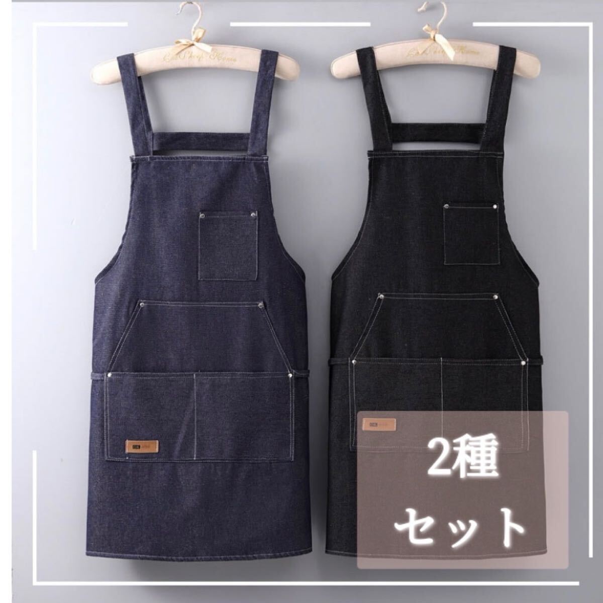 - 【再入荷】デニムエプロン 2枚セット 男女兼用 黒×紺 カフェ お揃い 料理 園芸 掃除