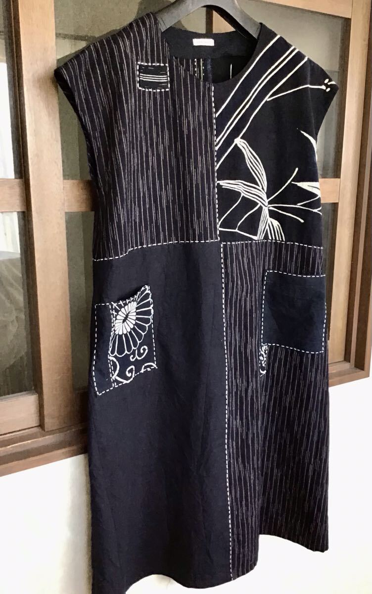 - 着物リメイク ワンピース チュニック ジャンパースカート 古布リメイク 縞 無地藍染 型染め 刺し子 ハンドメイド