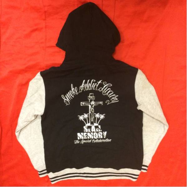 - MEMORY フード付 フルスナップ釦 スウェットパーカ 黒×グレー L