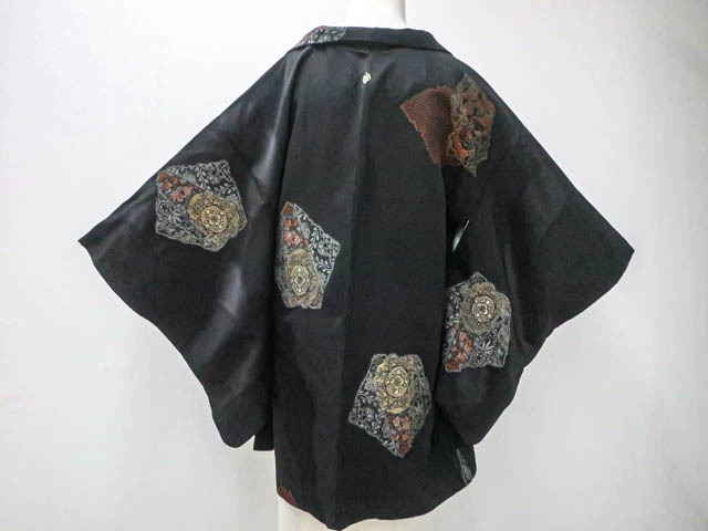 > 《古美術京松》リサイクル着物 黒羽織 アンティーク 一つ紋 漆 羽織紐付 正絹 身丈約83.5cm 裄丈64cm kyo7z08-896