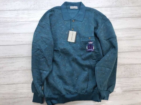 > 新品タグ付き Joseph Myerchin メンズ レトロ 刺繍 総柄 ハーフボタン 裏起毛 スウェット ポロシャツ トレーナー ポリエステル100% LL 青