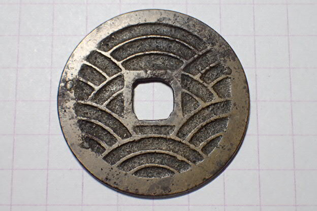 - 珍327-5 短尾寛欠永柱(背繊波)1768年 江戸深川千田新田 21波4文銭 寛永通寶 古銭 銅銭 穴銭 江戸時代