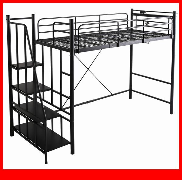 - ロフトベッド★新品/大人かわいいインテリア 階段付き パイプロフトベッド/2段階高さ調整 ハイ ミドル 宮 コンセント付/ブラック/a1