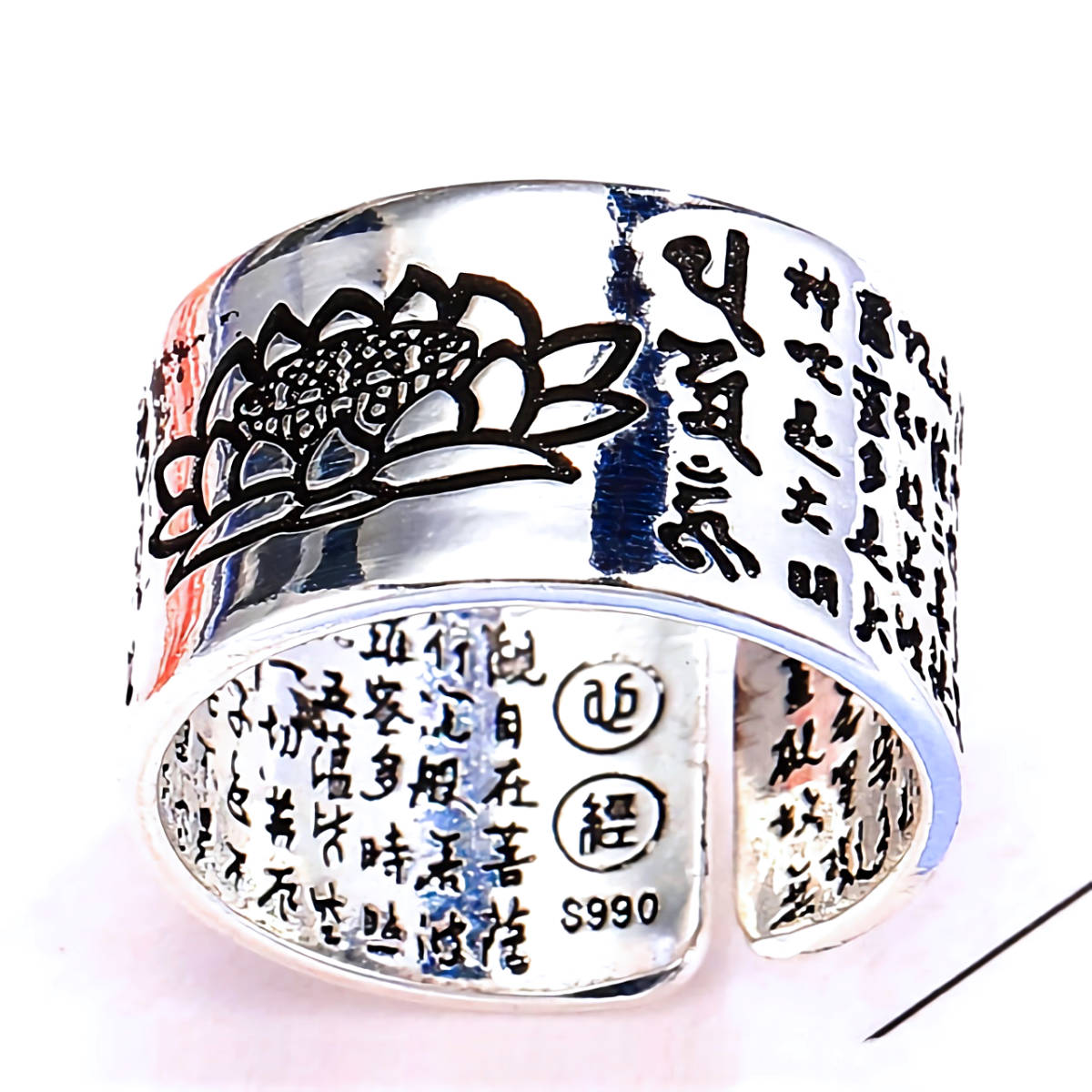 - 新品★送料無料★長寿の蓮花彫刻 フリーサイズ 般若心境メンズプラチナ仕上シルバーリング 誕生日プレゼント旅行連休秋ギフト国内発送