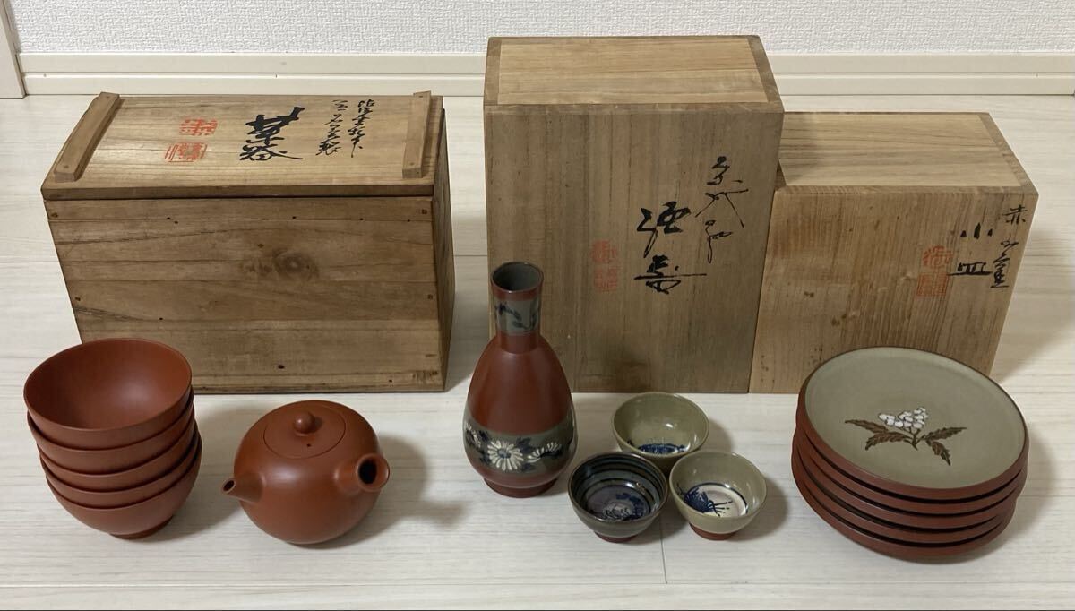 - 佐渡 無明異焼 人間国宝 伊藤赤水 まとめセット!二代 三代 五代 赤水窯 赤水焼 茶器 急須 酒器 皿 茶道具 煎茶 朱泥 在銘 共箱 骨董