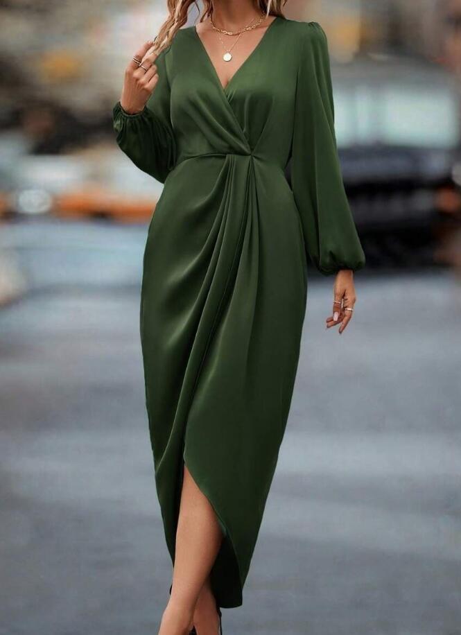 - M1211 ワンピースレディース● 着心地抜群 20代30代40代 ●大活躍 dress 光沢 ロング丈 ダークグリーン