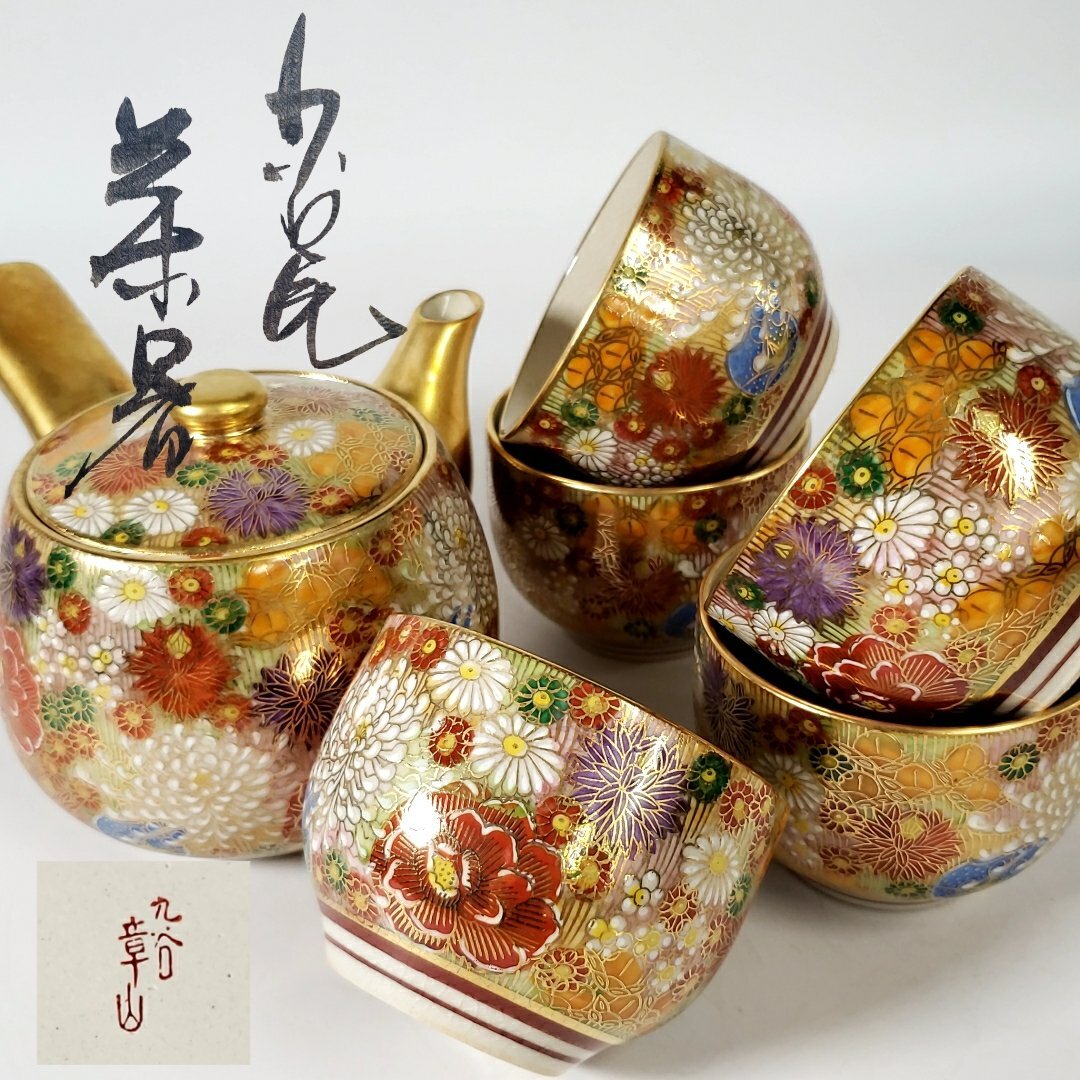 - 九谷焼 章山 茶器揃 金彩花詰紋 共箱付 金彩 華詰 急須 湯呑み 茶器 煎茶道具 茶道具 色絵 伝統工芸品 日本の陶器 骨董 蔵出し【100r848】