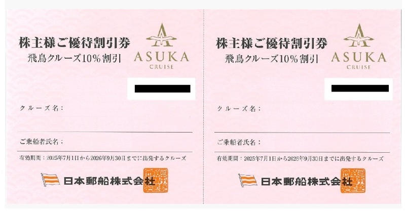 - ★飛鳥クルーズご優待割引券2枚セット★ペア★4枚(2セット)あり★日本郵船株式会社☆株主★10%割引券☆2枚★2026.9.30までに出発★