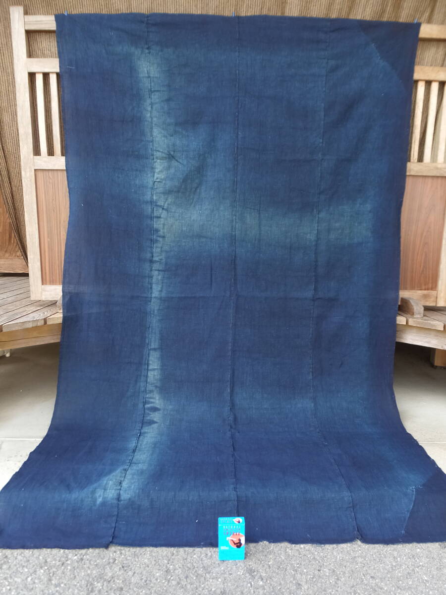 > 使い込まれ青い色褪せ面白い手織り藍木綿古布・長い4幅繋ぎ・縦202×幅128㌢・総重330g・小傷・リメイク素材