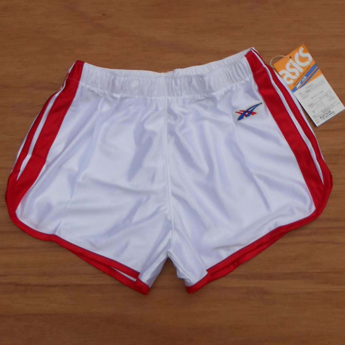 > 未使用 '80s asics PAW アシックス パウ PW8802 ポリエステル 光沢 ホワイトxレッド 72~79 ランパン ショートパンツ 短パン デッドストック