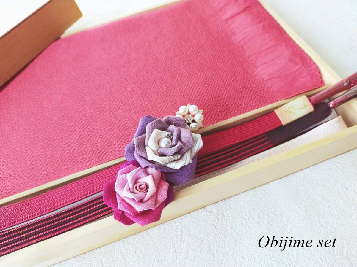 - ⚜ 正絹 薔薇つまみ細工帯留 帯締め 帯揚げ,3点【ローズ系】即決は重ねレースプレゼント