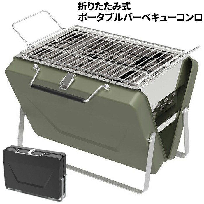 - 訳あり★新品◆バーベキューコンロ 卓上グリル トランク型 ステンレスグリル 焚き火台 焼肉 アウトドア キャンプ###コンロX6-005-GR###
