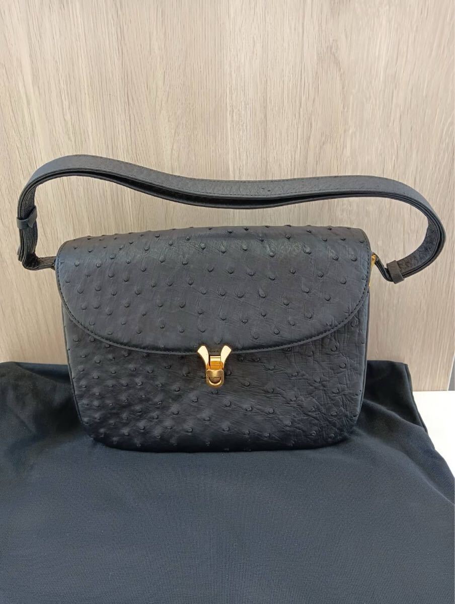 - 【中古品】オーストリッチ ショルダーバッグ 黒ブラック 肩掛け バッグかばん 保存袋付き 現状品