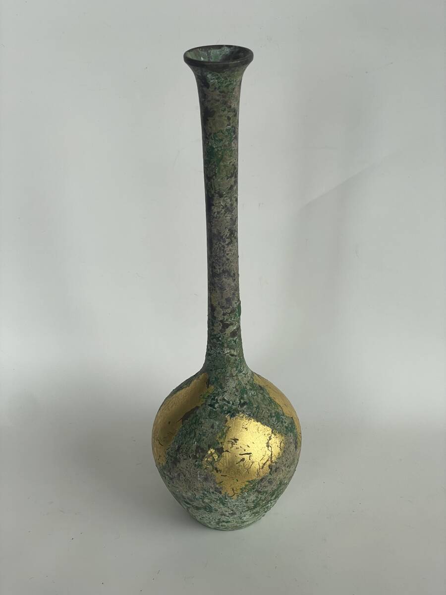 - 高岡銅器 峰雲作 鋳銅 青銅 花瓶 純金箔 本金 花生 鶴首 和 モダン 北欧