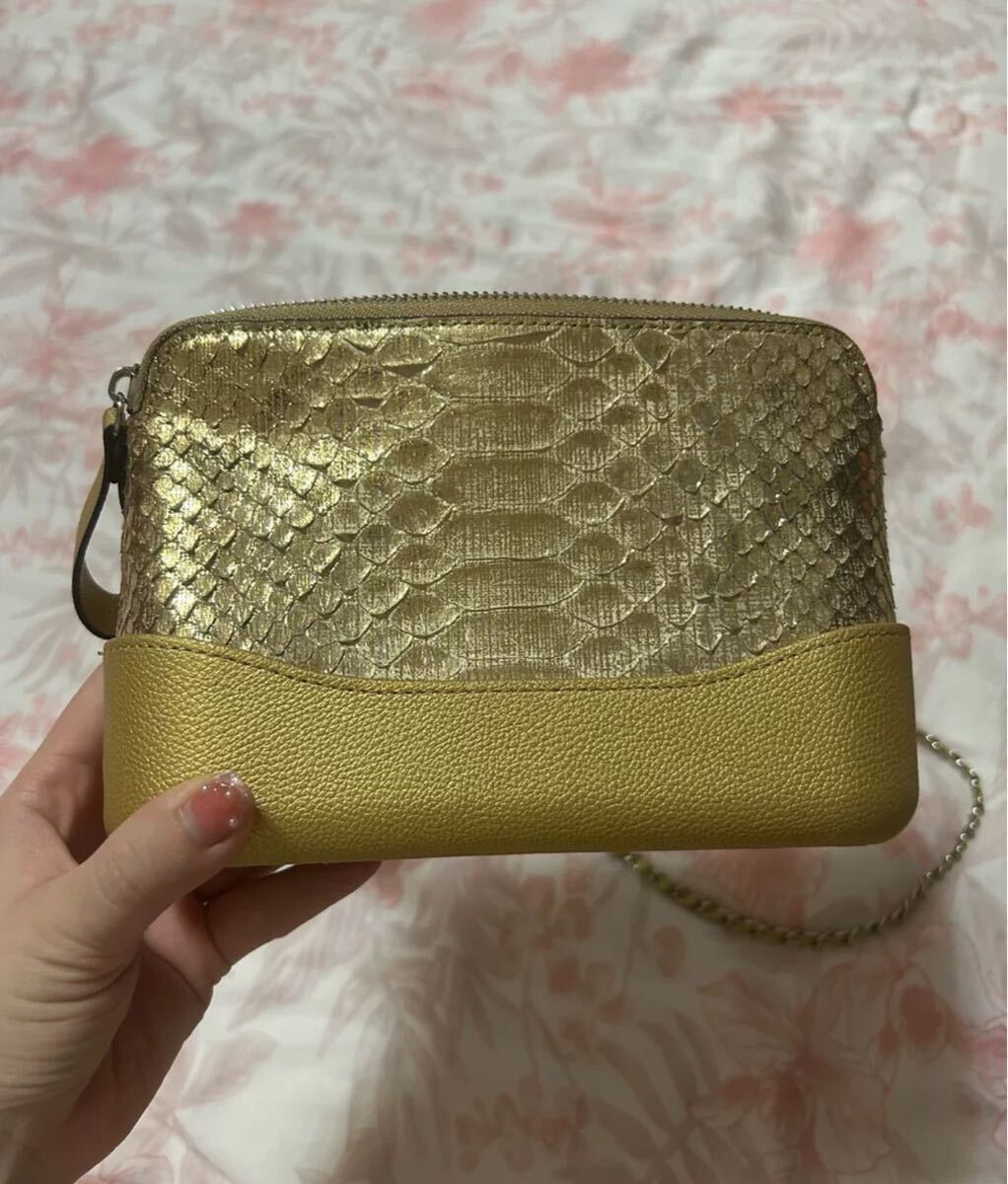 - 職人手作り 一点物 ゴールド 金色 蛇革 牛革 バッグ ショルダーバッグ