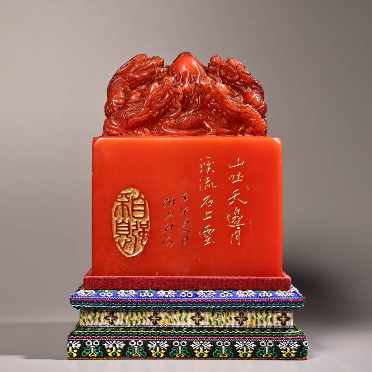 - 清代風 寿山石 紅田黄石彫 描金 盤龍鈕 九龍戯珠 手彫り 印章 印鑑 印璽 置物擺件 極細工 旧家蔵出し中国唐物 時代物 骨董 中国古美術