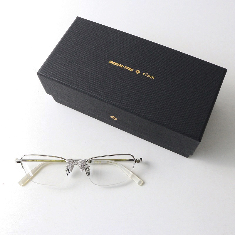 > 未使用 イヴミン YVMIN × シュシュトング SHUSHUTONG ハーフリム リボン グラス |シルバー パヴェ メタル【2400014629330】