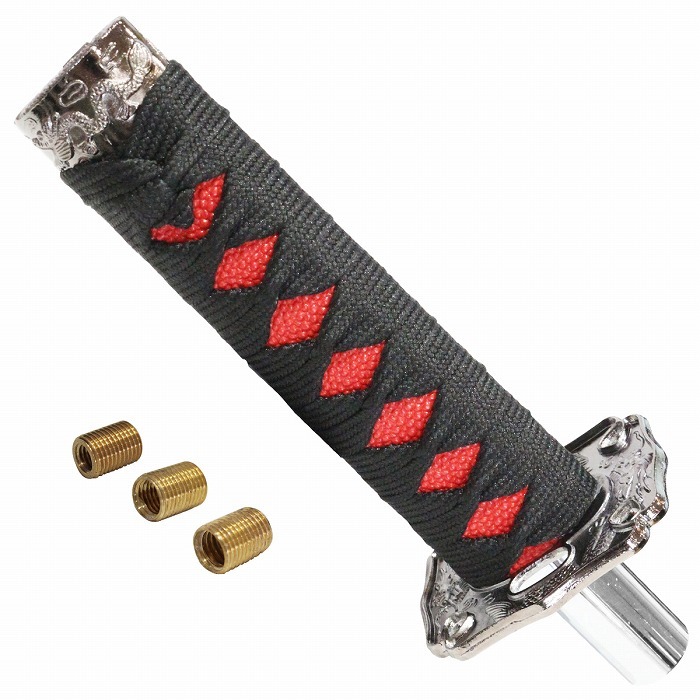 - 【送料380円】日本刀 AT MT 対応 延長 シフト ノブ 150mm 黒×赤 刀 トラック 軽トラ 乗用車 軽自動車 和柄 オートマ マニュアル 変換付き