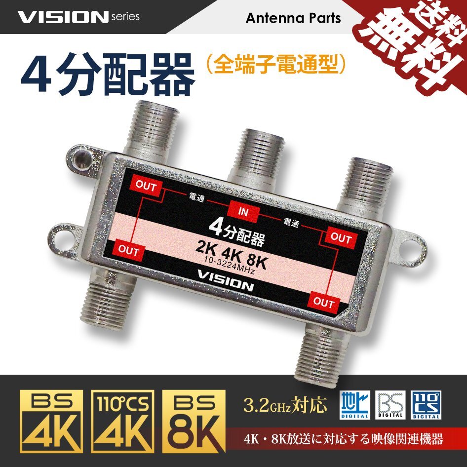 - 4分配器 1年保証 4K 8K 対応 TV テレビ アンテナ 全端子電通型 3.2GHz F型 地デジ BS CS 衛星放送 分配 ネコポス VISION 送料無料