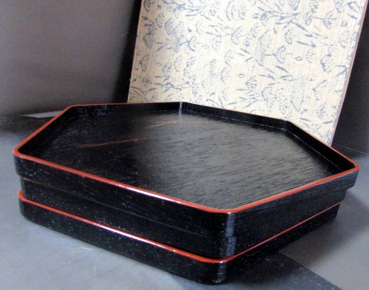 - 天然木漆器 六角盆 会席盆 縁朱松葉文様 菓子器 菓子盆(3枚組)約27.5cmxH1.8㎝)